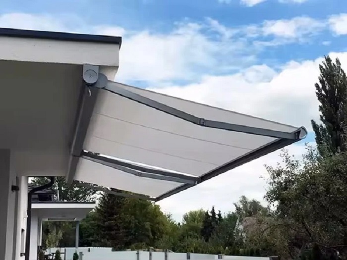 Выдвижная маркиза – это конструкция, состоящая из прочного алюминиевого каркаса, ткани и механизма раскладывания. Основным элементом являются так называемые «локти» – специальные рычаги, которые выдвигают тканевое полотно вперед, создавая навес.